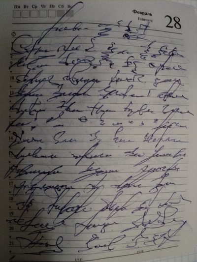 Полностью отсутствует. Ежедневник с записями не содержал страниц с такой информацией, так как в нем отсутствовала пост-титульная часть (первые страницы ежедневника). Сам ежедневник подписан именем: Петров Иоанн.